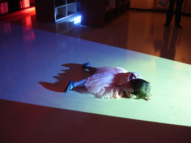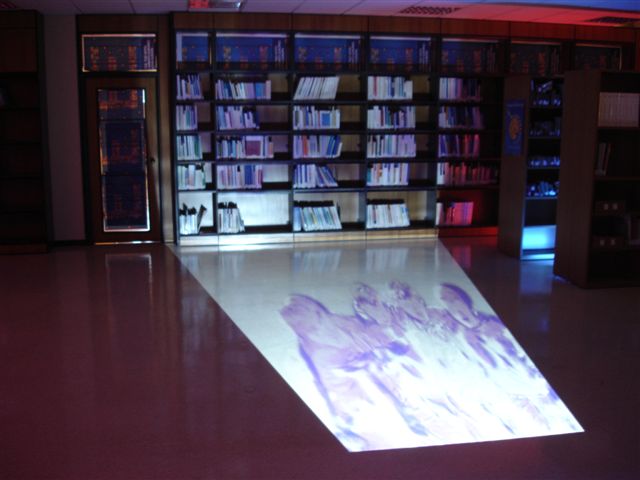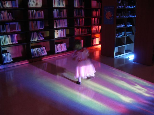 Allestimento dell'artista Eric Michel. Lo spazio della biblioteca trasformato dalla luce (1-2-3).