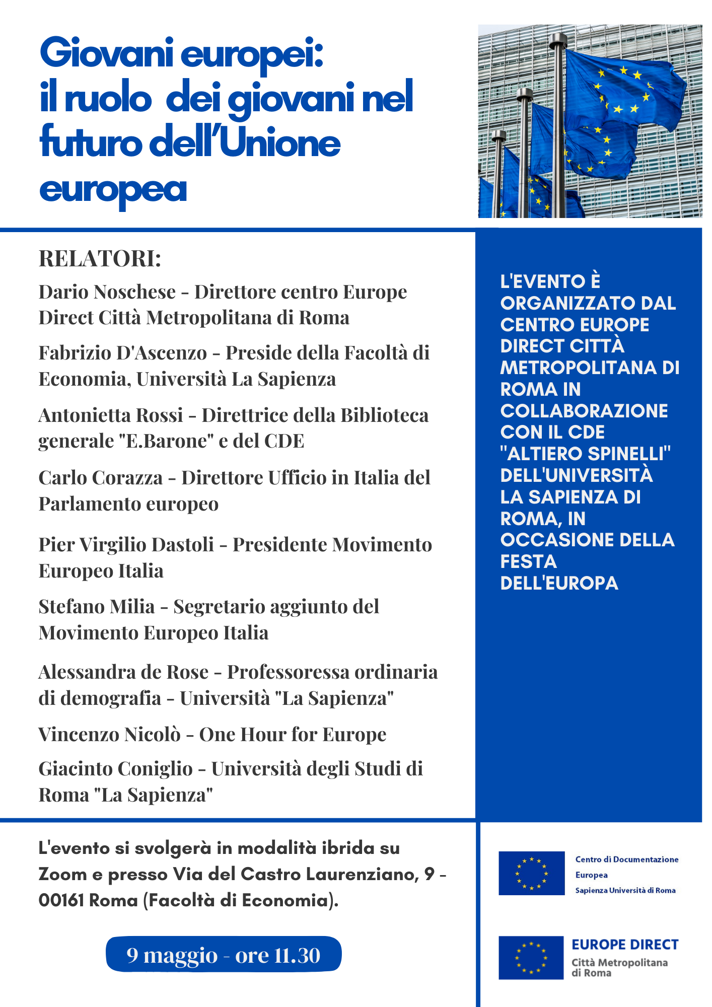 Incontro organizzato dal CDE "A: Spinelli" e dallo Europe Direct Città Metropolitana di Roma per approfondire il tema Anno Europeo dei Giovani e Conferenza sul futuro dell'Europa. Interverranno tra gli altri Pier Virgilio Dastoli, presidente del Movimento europeo Italia e Carlo Corazza Direttore dell'Ufficio in Italia dal PE. Studenti parleranno della loro esperienza di studio europea.