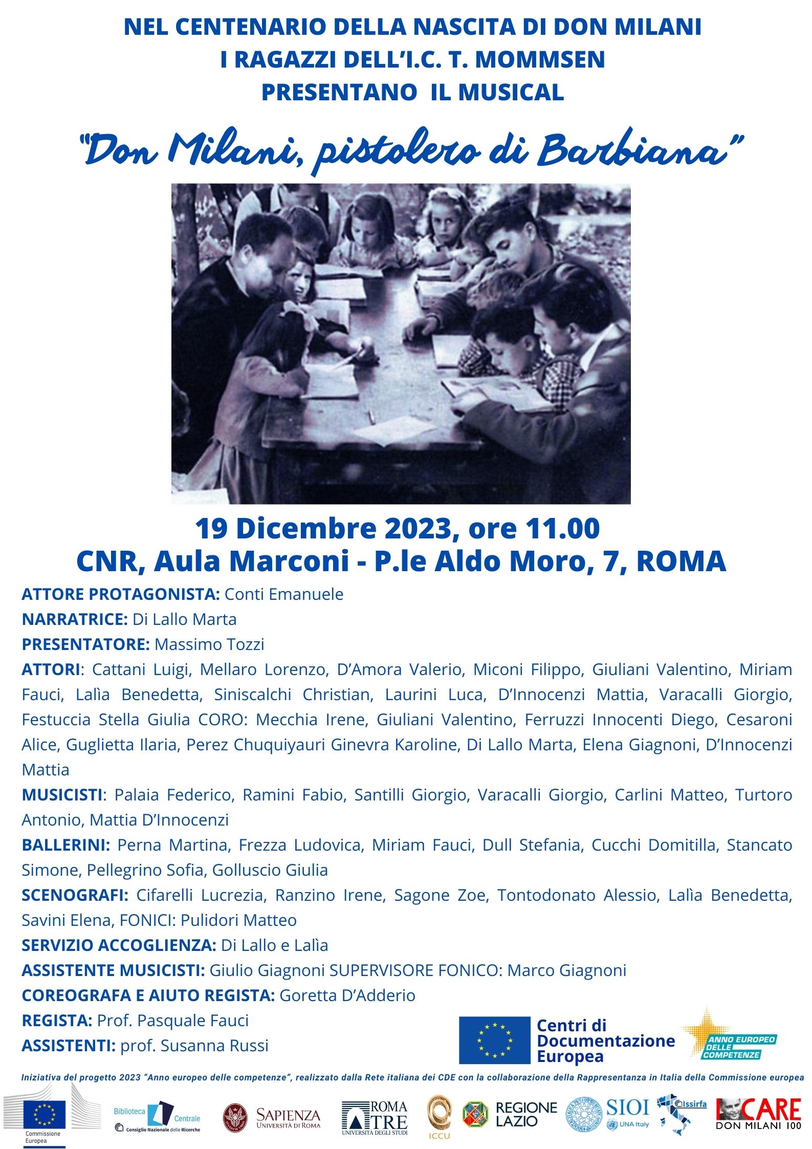 I ragazzi dell’I.C.T. Mommsen presentano il musical, realizzato per il centenario anni della nascita di Don Milani, da loro ideato e messo in scena, “Il pistolero di Barbiana”. A seguire un incontro, con i ragazzi presenti, sulle azioni dell’Unione Europea a favore dell’istruzione e della formazione.